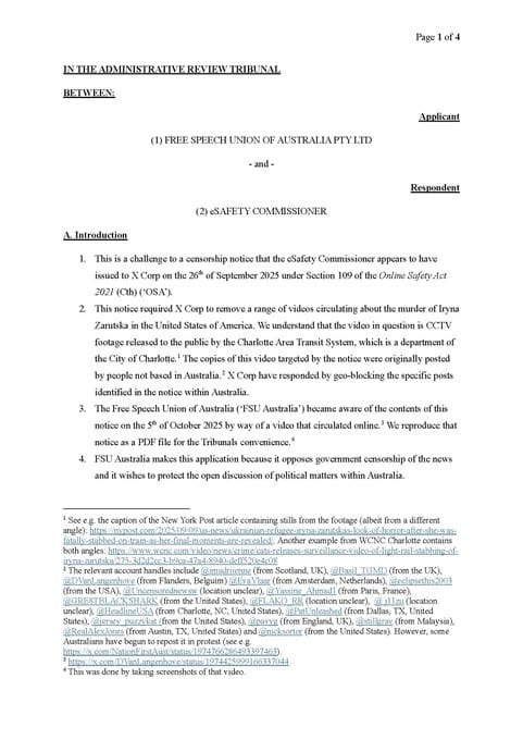 Constitutional concerns: The FSU argues that while the Commissioner claims to be censoring the video itself, the practical effect is censoring the tweets and public discourse surrounding them. The submissions state this “breaches an important constitutional right in Australia” - specifically, the implied freedom of political communication recognized by Australian courts.