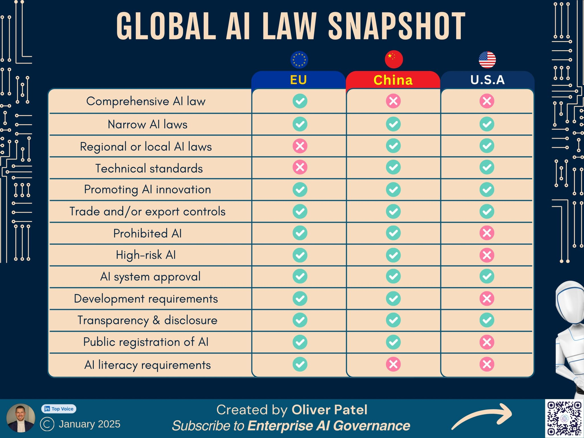 - โ EU & China: Stringent rules for high-risk AI.- โ USA: No federal framework; sector-specific rules exist.