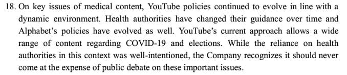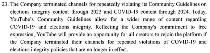 The company’s letter specifically states: “Reflecting the Company’s commitment to free expression, YouTube will provide an opportunity for all creators to rejoin the platform if the company terminated their channels for repeated violations of COVID-19 and elections integrity policies that are no longer in effect.”
