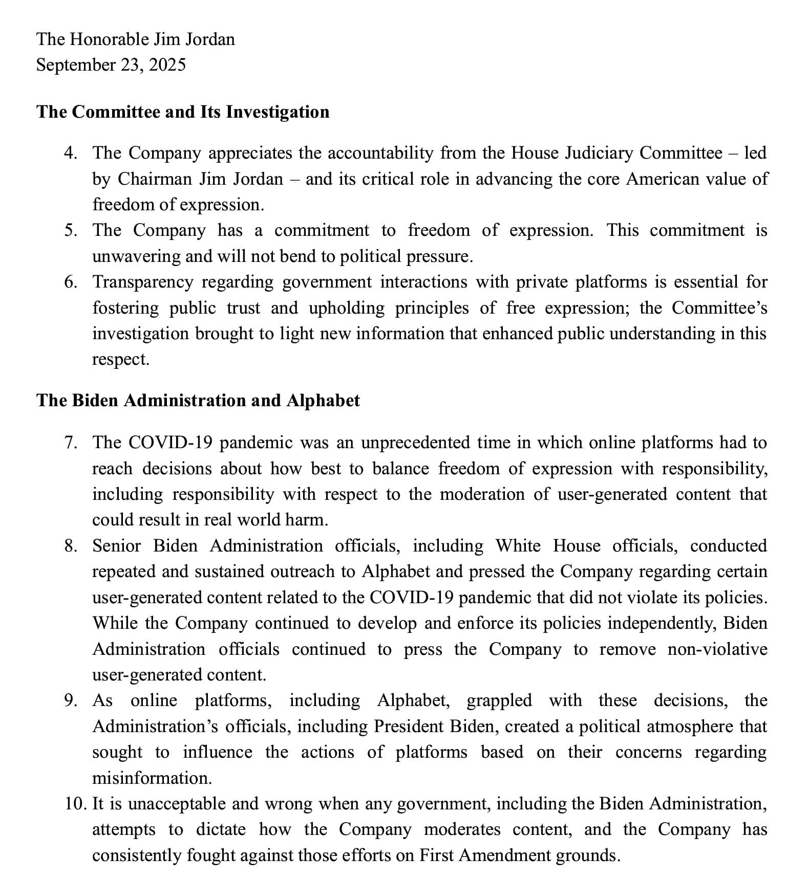 In the letter, Google explicitly stated: “Senior Biden Administration officials, including White House officials, conducted repeated and sustained outreach to Alphabet and pressed the Company regarding certain user-generated content related to the COVID-19 pandemic that did not violate its policies.”