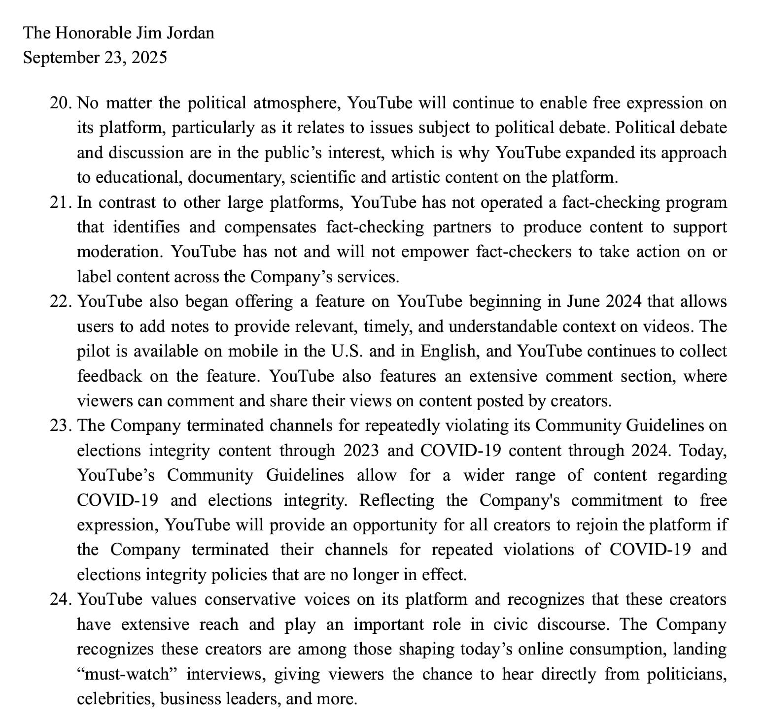 - No Third-Party Fact-Checkers: “YouTube has not and will not empower fact-checkers to take action on or label content across the Company’s services.”2. Creator Reinstatement: “Reflecting the Company’s commitment to free expression, YouTube will provide an opportunity for all creators to rejoin the platform if the Company terminated their channels for repeated violations of COVID-19 and elections integrity policies that are no longer in effect.”3. Community Notes Implementation: YouTube began offering a Community Notes feature in June 2024, similar to X’s approach, allowing users to add context to videos.4. Unwavering Commitment: “The Company has a commitment to freedom of expression. This commitment is unwavering and will not bend to political pressure.”