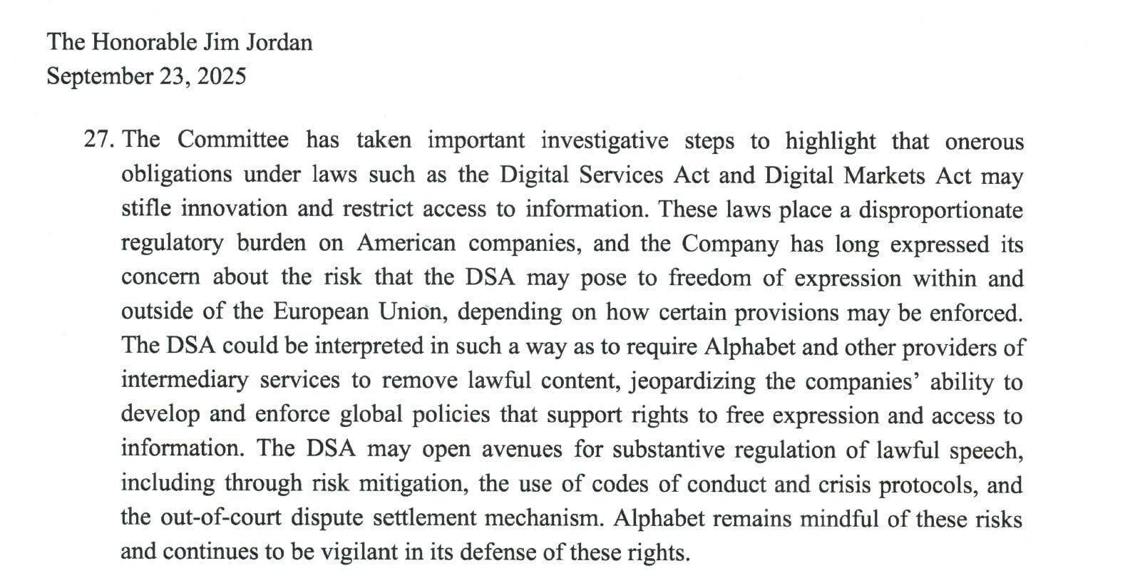 Google warned that the EU’s Digital Services Act “could risk freedom of expression within and outside of the European Union,” effectively allowing foreign governments to determine what Americans can say online. This represents an unprecedented threat to American digital sovereignty.