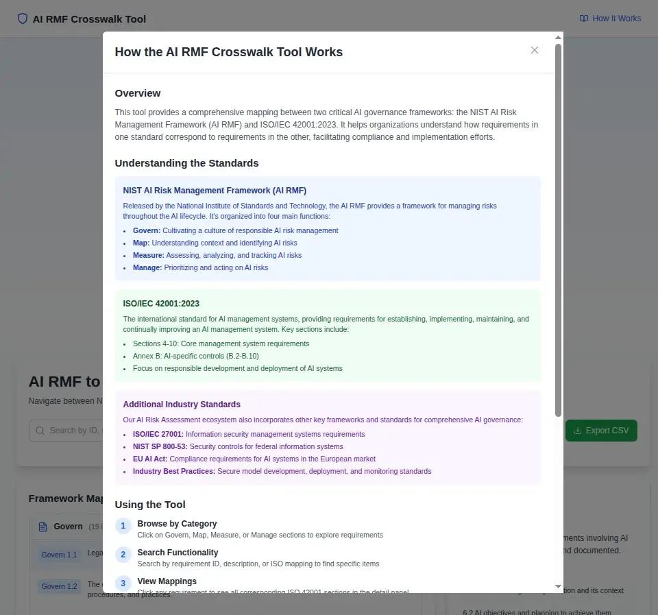 - Instant Search: Find requirements across both frameworks simultaneously- Category Filtering: Navigate through Govern, Map, Measure, and Manage functions- Detailed Mappings: Click any requirement to see all corresponding standards- Export Functionality: Download complete crosswalk data as CSV for documentation- Mobile Responsive: Access your compliance data anywhere, anytime