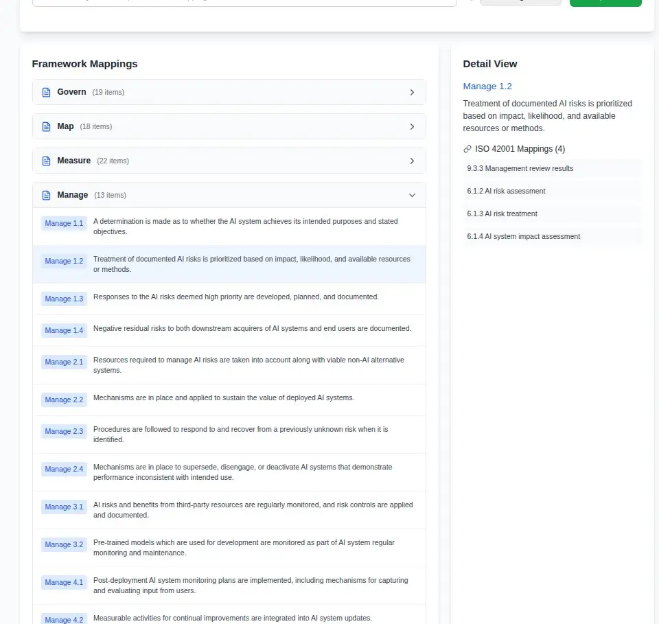 - Gap Analysis: Quickly identify which ISO 42001 requirements are covered by your NIST AI RMF implementation2. Audit Preparation: Demonstrate compliance across both frameworks with clear mapping documentation3. Implementation Planning: Design AI governance programs that efficiently satisfy both standards4. Team Collaboration: Export and share specific mappings with stakeholders