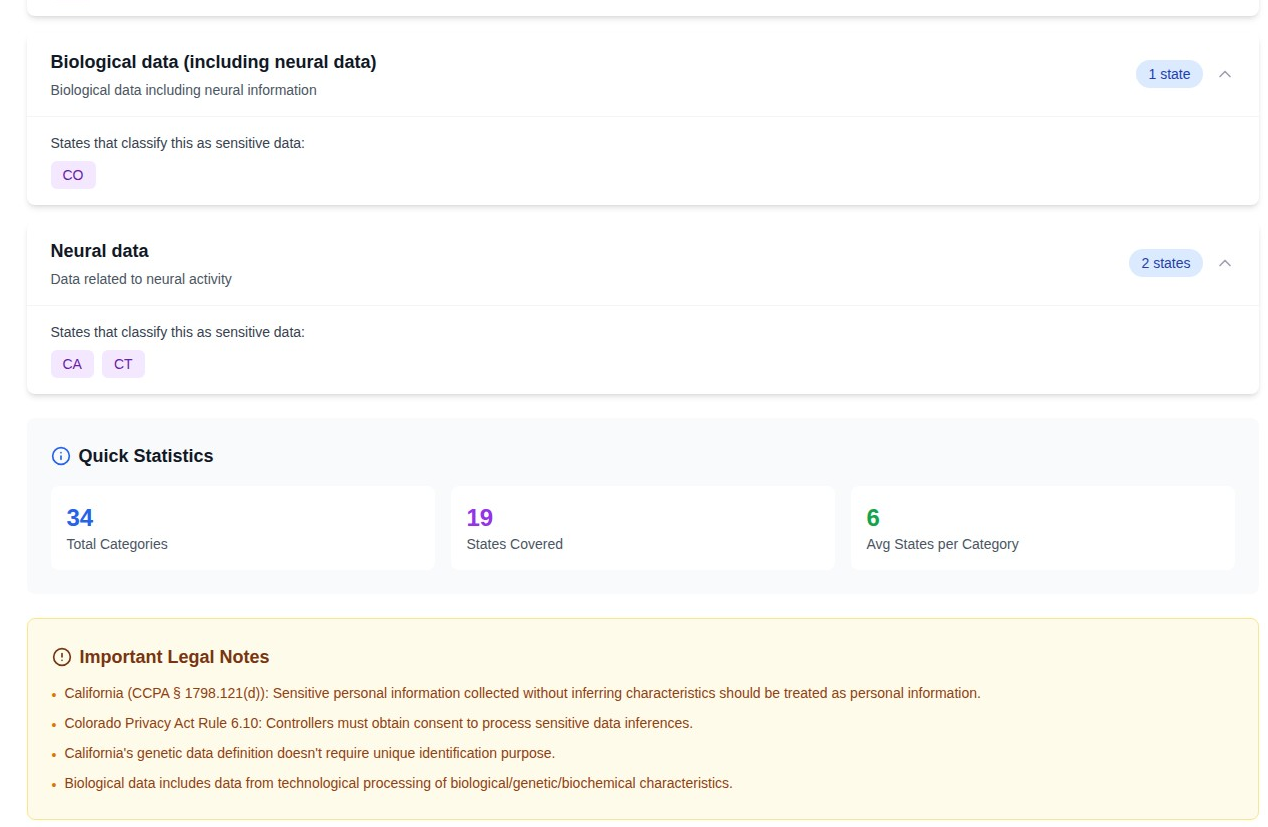 - Legal Nuances: Some states have specific conditions (e.g., Californiaโs CCPA ยง 1798.121(d) regarding inferences)2. Regular Updates: Privacy laws evolve; always verify current requirements3. Professional Guidance: The tool supplements but doesnโt replace legal counsel