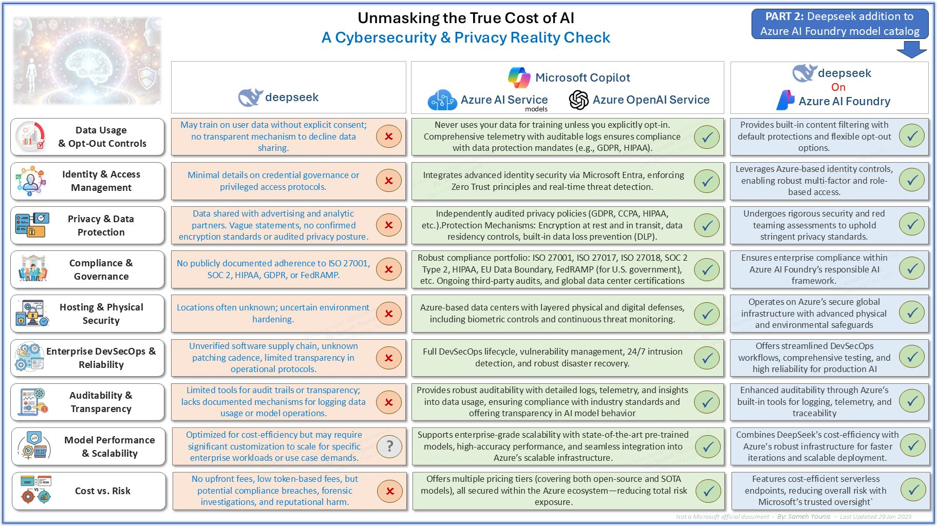 The infographic, titled “Unmasking the True Cost of AI: A Cybersecurity & Privacy Reality Check,” compares different AI offerings across various categories. On one side, we see an AI solution labeled “deapseek,” and on the other side are Azure AI Services (including Microsoft Copilot and Azure OpenAI Service) and the hybrid model Deepseek on Azure AI Foundry.