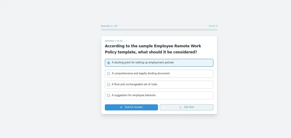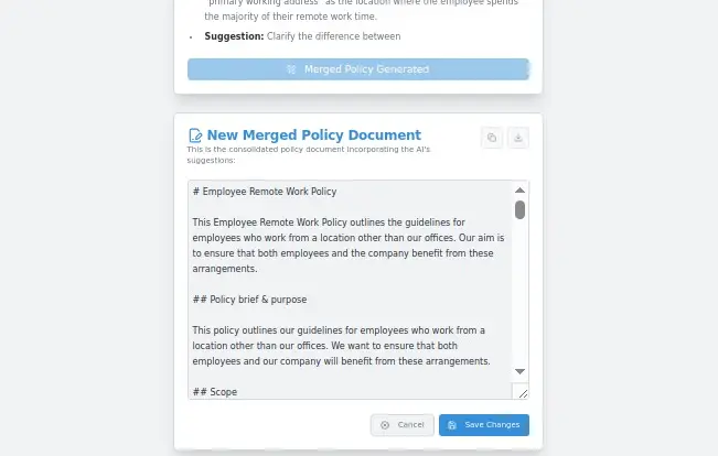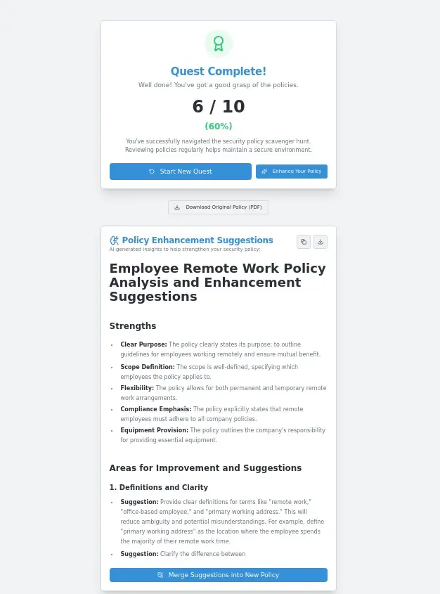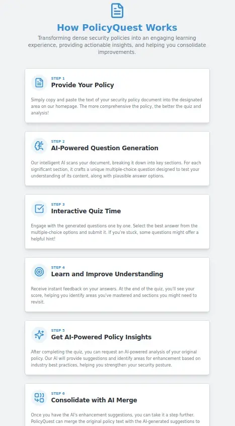 - Provide your policy document2. AI generates targeted questions3. Complete the interactive quiz4. Review feedback and identify knowledge gaps5. Receive AI-powered policy enhancement suggestions6. Merge improvements into an updated document