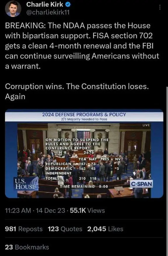 The recent decision by Congress to extend Section 702 of the Foreign Intelligence Surveillance Act (FISA) as part of the National Defense Authorization Act (NDAA) has been a topic of considerable debate and controversy. Here is an overview of the key aspects and perspectives on this issue: