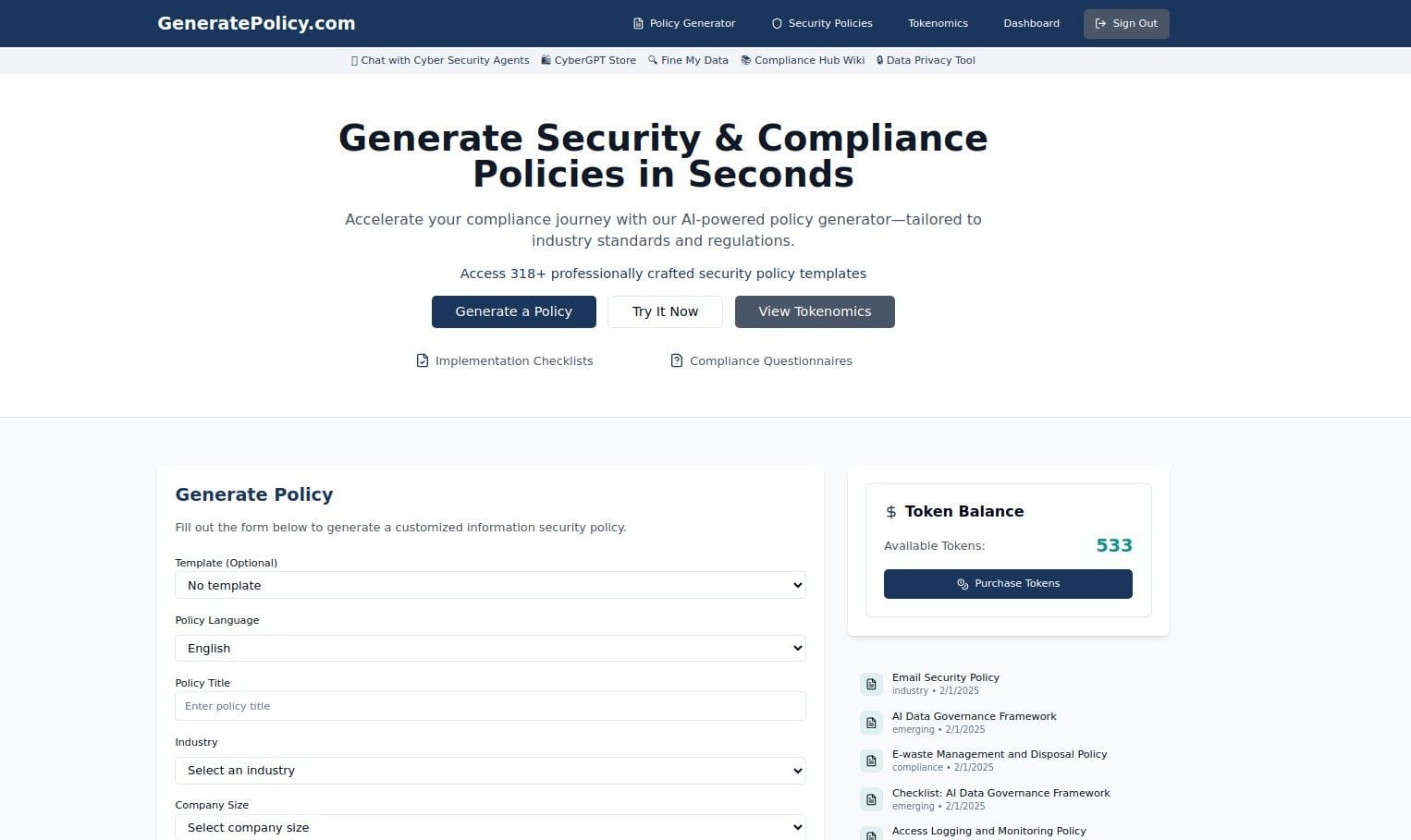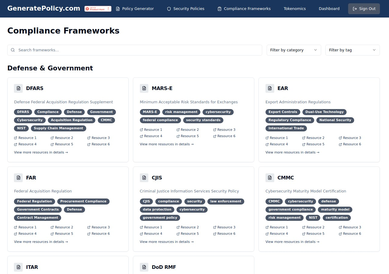 - AI-Powered Policy Generation: At its core, GeneratePolicy.com utilizes AI algorithms to create policies that are not only comprehensive but also aligned with industry best practices and standards.- Support for Major Compliance Frameworks: The platform supports a wide range of major cybersecurity and compliance frameworks, including NIST, ISO 27001, CIS, OWASP, MITRE ATT&CK, GDPR, HIPAA, and PCI DSS. This ensures that the policies you generate are relevant to your specific compliance obligations.- Easy Customization: While the AI provides a strong foundation, policies are easily customizable to match your organizationโs specific operational needs and risk profile.- Continuous Updates: Staying compliant requires policies to be up-to-date with evolving regulations and industry shifts. GeneratePolicy.com offers continuous updates to policies, ensuring your documentation remains current.- User-Friendly Dashboard: Managing your policies is simple with the user-friendly dashboard, allowing you to easily access, update, and download your documents.- Token-Based Pricing: The token-based pricing model offers a scalable and flexible approach. You purchase tokens and use them to create or update policies as needed, making it an affordable solution for companies of all sizes.- Compliance Ready: Policies generated by the platform are designed to support and align with various regulatory requirements like GDPR, HIPAA, and PCI DSS.- Time and Cost Savings: GeneratePolicy.com significantly reduces the time and cost associated with cybersecurity policy creation. What used to take weeks can now be accomplished in minutes.- Enhanced Security Posture: By providing professional-grade documentation, GeneratePolicy.com helps enhance your organizationโs overall cybersecurity posture.- Seamless Integration: The platform offers a simple web-based interface, and policies can be downloaded in multiple formats (PDF, Word) for easy integration into your existing documentation workflows and compliance dashboards.- Rapid Onboarding: Getting started with GeneratePolicy.com is quick and easy, providing immediate value with minimal onboarding time.