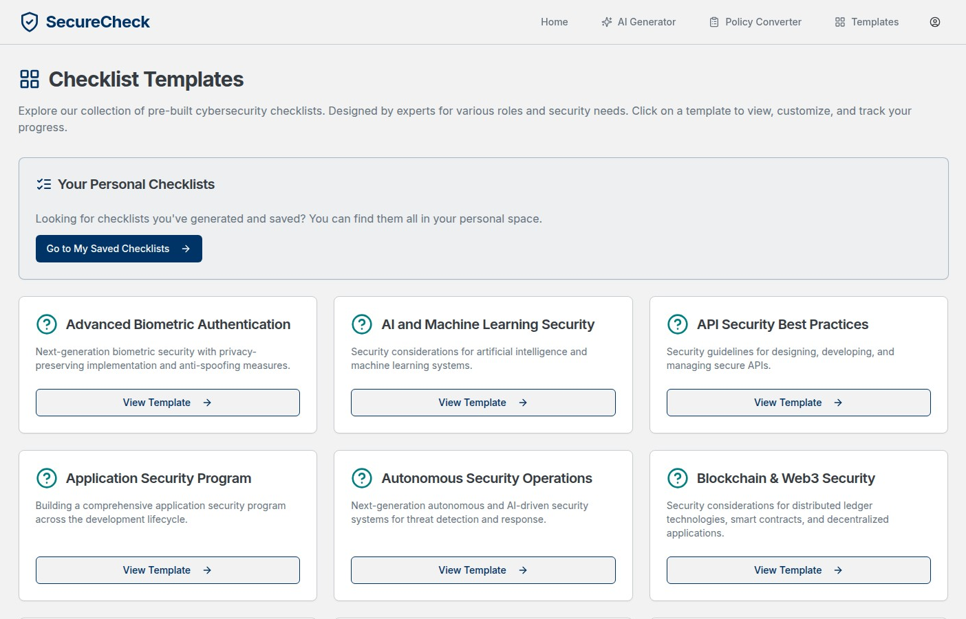 - Browse Our Templates: Explore our comprehensive library of 70+ security checklists2. Generate Custom Checklists: Use our AI generator for unique requirements3. Track Your Progress: Monitor implementation and completion rates4. Scale Your Program: Add more teams, departments, and security domains over time