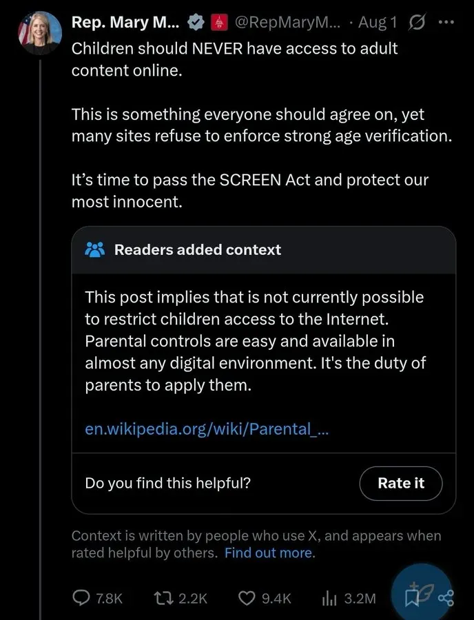 United States: Congresswoman Mary Miller’s push for the SCREEN Act faced significant backlash when community notes on X exposed the true implications of “age verification.” Her claim that “children should NEVER have access to adult content online” was met with widespread criticism, with users pointing out that parental controls already exist and that government-mandated verification threatens everyone’s privacy.