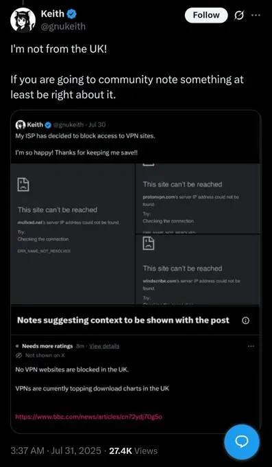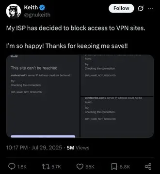 Perhaps most alarmingly, ISPs are now actively blocking access to VPN websites. Users worldwide—not just in authoritarian countries—are reporting DNS blocks preventing them from even visiting VPN provider sites. One user’s post went viral on July 29, 2025, showing their ISP blocking VPN access despite not being in the UK, proving this is a coordinated global effort.