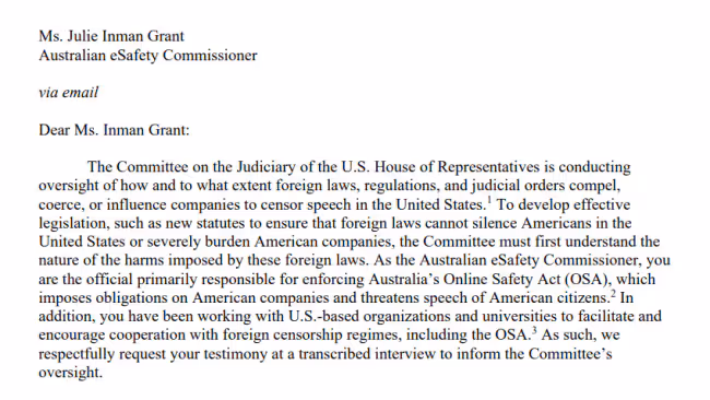 Jordan’s committee expresses concern over “the extraterritorial content moderation requirements of Australia’s Online Safety Act, eSafety’s attempts to mandate global content takedowns, and your collaboration with a US university and other foreign governments to design and implement a global censorship regime.”