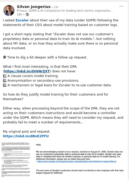 The individual’s follow-up request cut to the heart of the matter: “For avoidance of doubt, under GDPR Zscaler cannot discharge its obligations by referring me to my employer if Zscaler itself processes data as a controller for AI development or related purposes.”