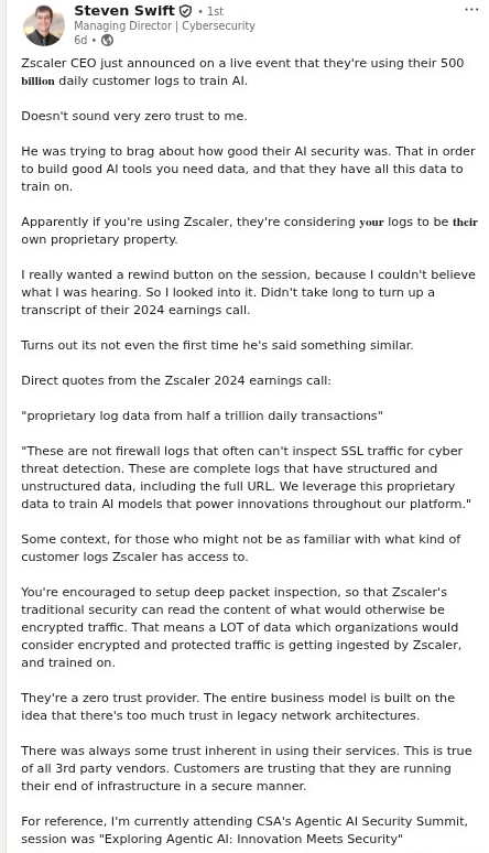 In a response from Zscaler CISO Sam Curry, the company stressed its commitment to responsible AI. “Zscaler does not use customer data to train its AI models,” Curry wrote. “Each customer owns their proprietary information or personal data … in the Zscaler logs. We only use data or metadata that does not contain customer or personal data for AI model training.”